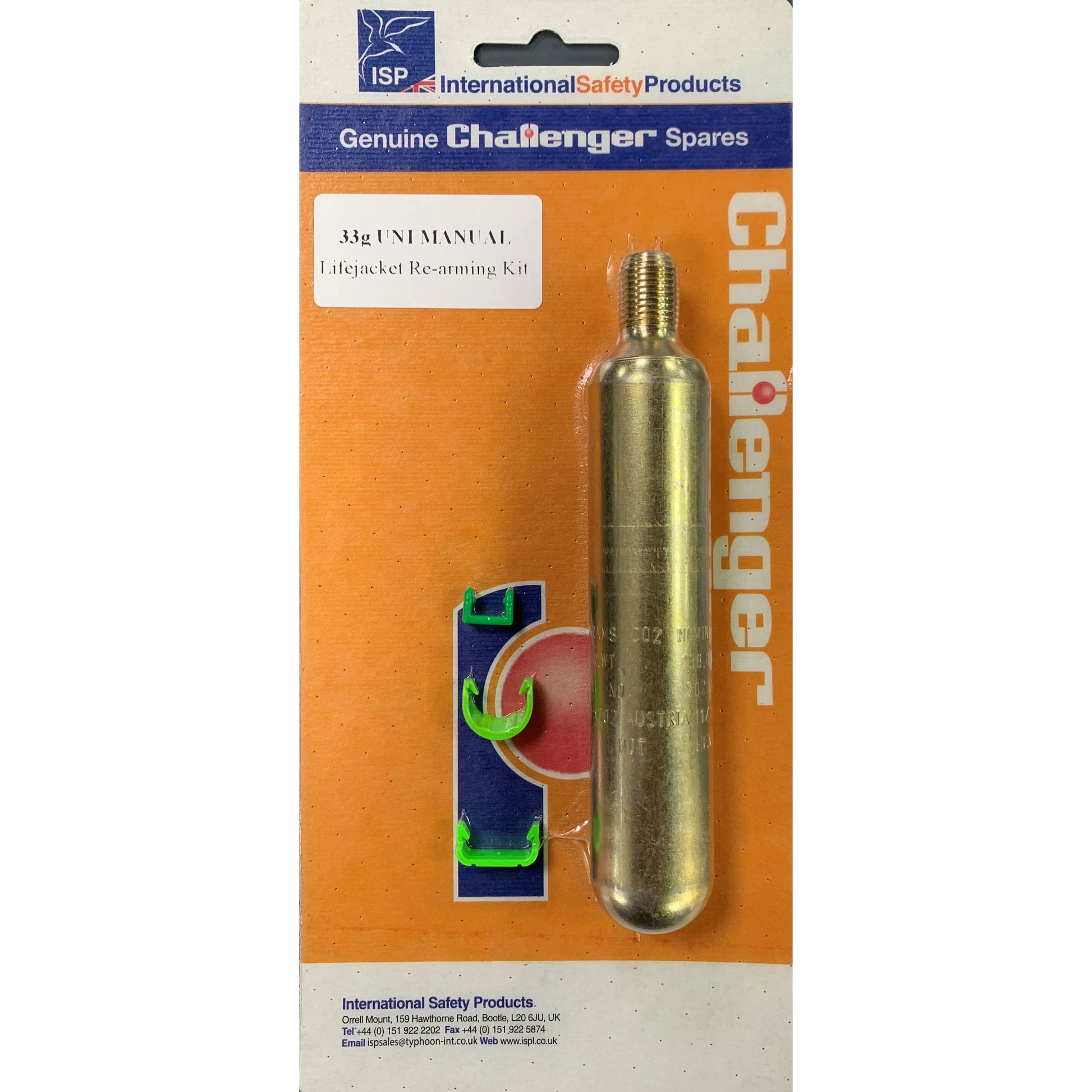 A convenient manual lifejacket pack with replacement parts including 33g cylinder and retaining clips.