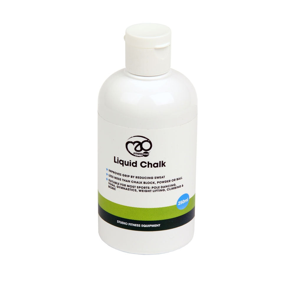 Fitness Mad Liquid Chalk is perfect for climbers, yoga, weight lifters and just about anyone who needs extra grip! It helps to inhibit sweating from your hands or feet and adds massive grip. Unlike chalk balls, there is no dust and little mess.
